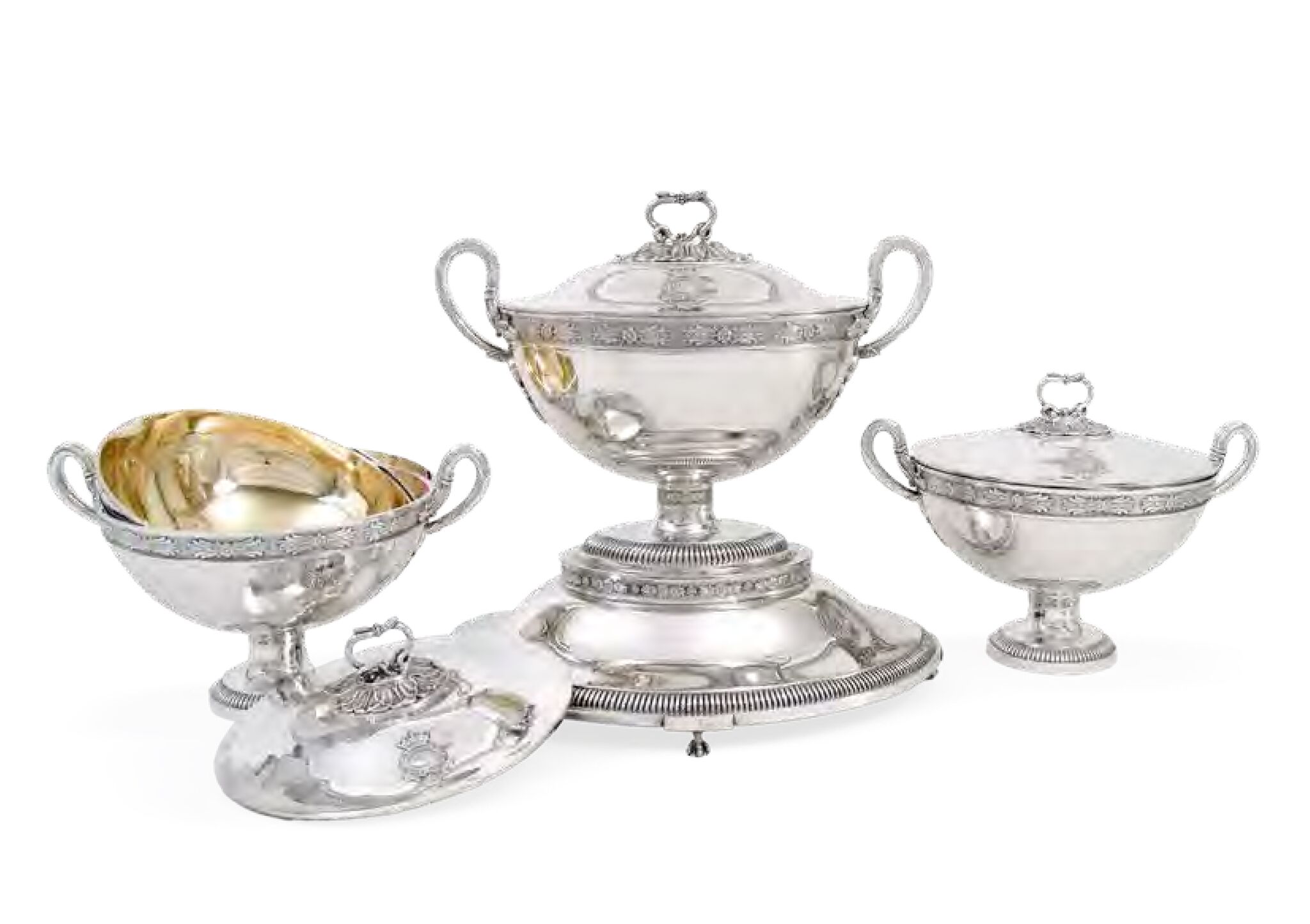 Der faszinierenden, Licht und Schatten erzeugenden Wechselwirkung von hochglanzpolierten Flächen mit plastisch gestalteten und ornamentierten Teilen widmet sich das fünfte Kapitel mit Silber aus Barock, Empire und Moderne. Besonders gut zu beobachten ist dies bei drei Terrinen aus dem Besitz von Ernst August I., König von Hannover, darunter zwei Exemplaren aus der Werkstatt von Henri Auguste, einem der führenden Pariser Silberschmiede des Klassizismus und Empire. Ein äußerst reizvolles Wechselspiel von Licht und Schatten lässt sich weiterhin an der wellenförmigen Oberfläche einer Mokkatasse mit Untertasse der Firma G. Bachelet in Paris ablesen, die 1889 auf der dortigen Weltausstellung für die Sammlung des Gmünder Kunstgewerbemuseums als Beispiel für Innovationen und Trendstücke angekauft wurde.