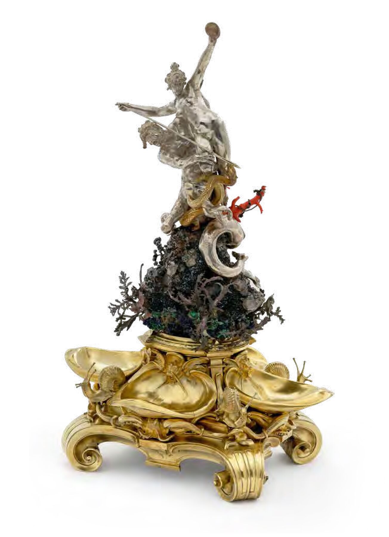 Ein Schiffspokal des Nürnberger Meisters Esaias zur Linden aus dem Jahr 1620, der 1911 aus dem Nachlass des Gmünder Silberwarenfabrikanten Albert Faber (1852–1911) in die Sammlung des Museums gelangte, lässt erahnen, weshalb sich Pokale in dieser Gefäßform in Zeiten der Entdeckungsreisen über die Meere als Tafelschmuck einer großen Wertschätzung erfreuten. Allein die Kühnheit, wie der Goldschmied, Ziseleur, Graveur, Emailleur und Bildhauer Wilhelm Widemann (1856–1915) in seinem Tafelaufsatz „Triton mit Meeresnymphe“ von 1890 Metalle – Silber und vergoldetes Messing – mit organischen Materialien – Gestein sowie galvanisierte Korallen und Pflanzen – verbindet, machen das Exponat zu einem Hingucker. Als Leihgabe aus Privatbesitz verkörpert nicht zuletzt ein sehr seltener, formschöner Öl- und Essigständer, ein sogenannter Huilier des Gmünder Silberschmieds Moritz Ignaz Emer (1734–1808) im Stile des Rokoko, der sich in seiner Raffinesse an der französischen Speisekultur orientiert, den Lebensstil der Oberschicht Gmünds in der letzten Epoche der Reichsstadtzeit.