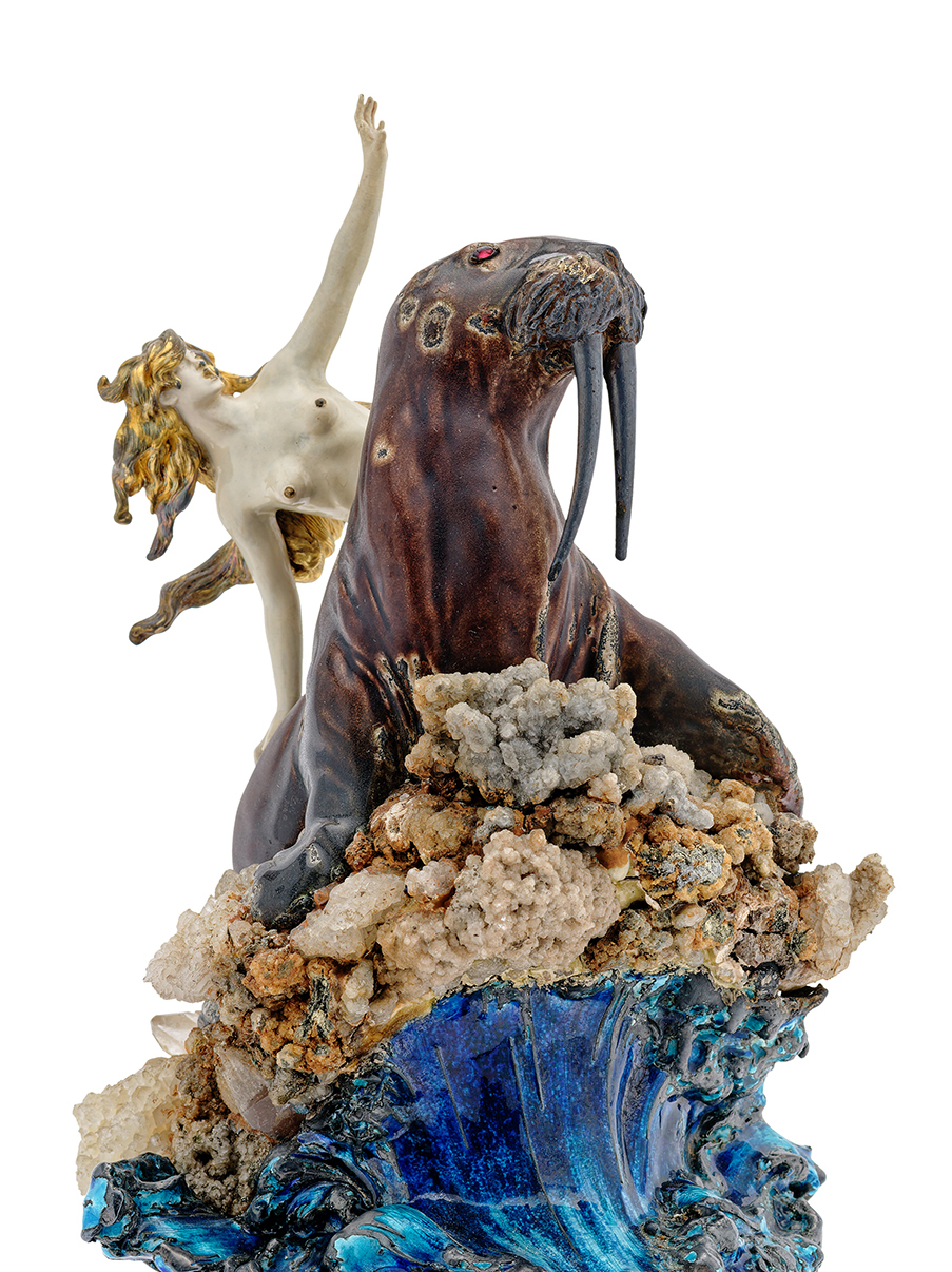 Welch außergewöhnliche Farbwirkungen sich mit Silber im Dialog mit anderen Metallen, mit farbigen Steinen und Email erreichen lassen, vergegenwärtigt das vierte Kapitel der Ausstellung. Prunkemails von Wilhelm Widemann sind exponierte Belege dafür, wie aus der Kombination von emaillierter Metallplastik mit Naturmaterialien fantastische Kunstwerke entstehen können. In Bechern, Döschen und Vasen akzentuieren sich die vielen Variationsmöglichkeiten, eine silberne Fläche farbig zu gestalten. Vergoldungen, Metalleinlagen (Niello) und Gravierungen zeigen sich exemplarisch an einem von der Firma F. Nicoud in Paris hergestellten und dort 1878 vom Gmünder Kunstgewerbemuseum erworbenen Becher. Daneben zeichnen leuchtend blaue Emailstreifen und exquisite Jugendstilornamentik eine Silbervase aus, die von Archibald Knox (1864–1933) für das Kaufhaus Liberty entworfen und 1908 in London vom Gmünder Kunstgewerbemuseum erworben wurde. Dass das Spektrum der Möglichkeiten bis zur Negierug des Materials reicht, lässt sich an einem durch Ätzung bearbeiteten Becher des Münchner Silberschmieds Peter Bauhuis (*1965) ablesen, dessen Oberfläche kaum noch an Silber denken lässt.