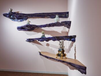 Bei dem Kunstobjekt handelt es sich um die »Floating Spiral Stair Case Steps to an Ecology of Mind«, ein in Entwurf und Verarbeitung außergewöhnliches Sammlungsmöbel, das der Präsentation von Kostbarkeiten dient. Geschaffen wurde die Arbeit 2014 von dem amerikanischen und konzeptionell arbeitenden Künstler Rem Denizen (*1980). Die Installation besteht aus vier in knorrigem Walnussholz geschnitzten Regalen, die vom Künstler mit einer blauvioletten Kugelschreibertinte lasiert wurden. Tilman Krause beschrieb die geheimnisvoll schillernde Materialität dieser Boards in seiner Ausstellungrezension »Was ich will, ist Magie!« (DIE WELT, 12.8.20) als eine »Augenlust« und eine »Verbeugung vor der Wunderkammerästhetik«. In der Tat war die Suche nach dem Wunderbaren für uns mit einem kunstgewerblichen Ansatz verknüpft. Dies entspricht der kunstgewerblichen Identität und Geschichte unseres Museums, das 1876 von Gmünder Silberfabrikanten nach dem Vorbild des heutigen Victoria & Albert Museums in London gegründet wurde. Die Tradition des Kunstgewerbemuseums weiterzuführen und im Zeitgenössischen weiterzuentwickeln, ist für das Museum im Prediger geradezu eine Verpflichtung.