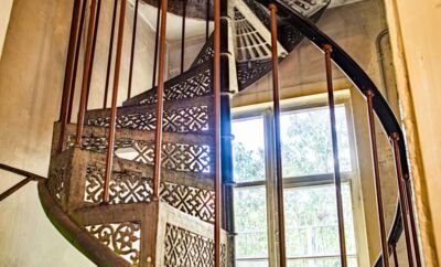 OTT-PAUSERSCHE FABRIK, Eiserne Wendeltreppe vom Erd- ins Obergeschoss. © Museum im Prediger Schwäbisch Gmünd, Foto: Elias Blumenzwerg. -