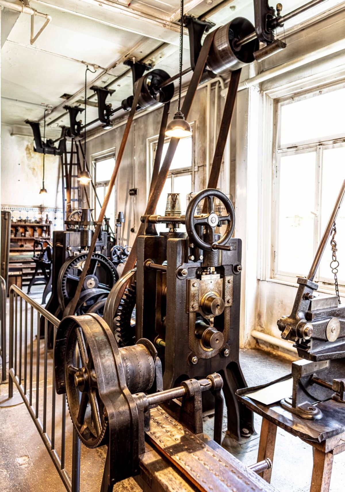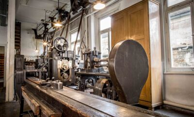 OTT-PAUSERSCHE FABRIK, Erdgeschoss, Metalldrückbank. © Museum im Prediger Schwäbisch Gmünd, Foto: Elias Blumenzwerg. -