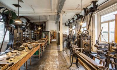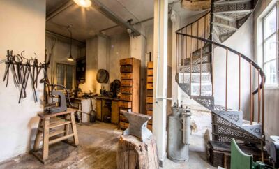 OTT-PAUSERSCHE FABRIK, Erdgeschoss, Fallhammer und Metalldrückbank. © Museum im Prediger Schwäbisch Gmünd, Foto: Elias Blumenzwerg. -