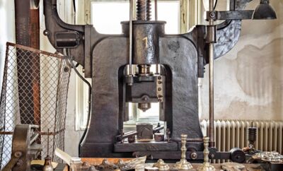 OTT-PAUSERSCHE FABRIK, Friktionsspindelpresse, ca.1900. © Museum im Prediger Schwäbisch Gmünd, Foto: Elias Blumenzwerg. -