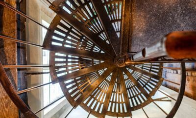OTT-PAUSERSCHE FABRIK, Wendeltreppe vom Erd- ins Obergeschoss. © Museum im Prediger Schwäbisch Gmünd, Foto: Elias Blumenzwerg. -